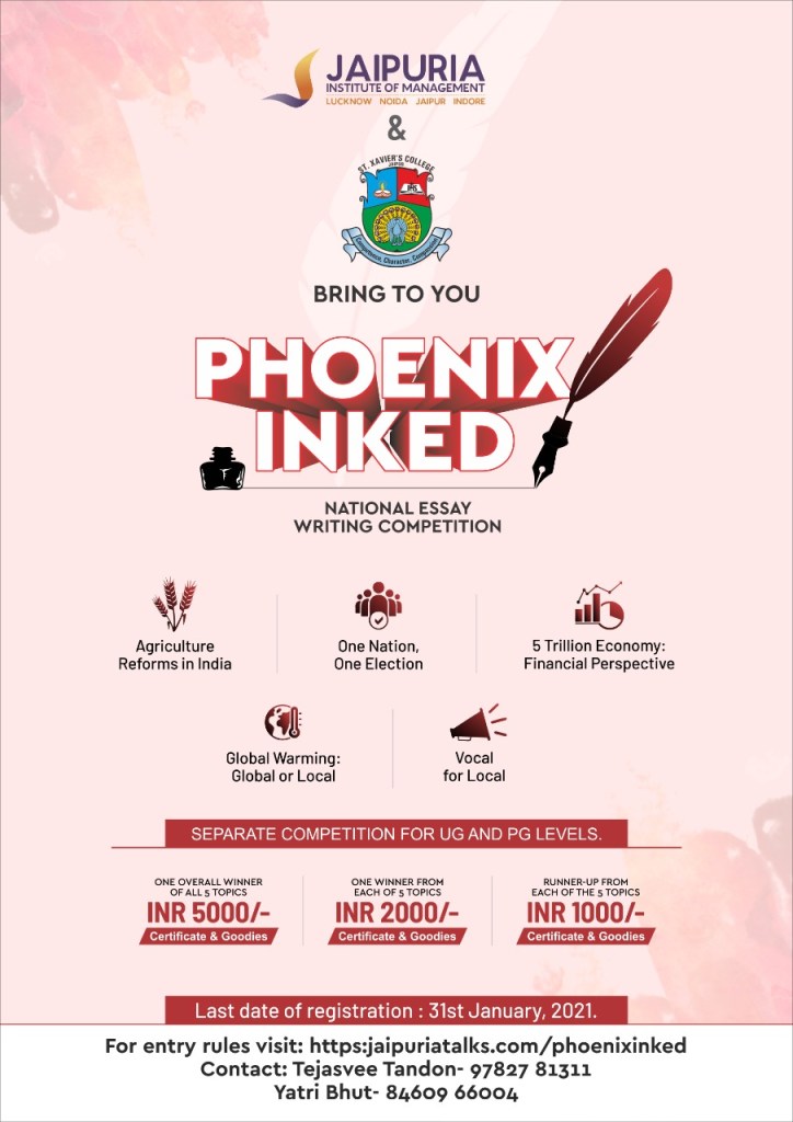 Jaipuria Institute of Management, Jaipur, and St. Xavier’s College, Jaipur, bring to you “Phoenix Inked” – National Essay Writing Competition on themes thoughtful and variant, urging the participant to put forth their opinions and views and thus bring about awareness and change that is much needed in the present times.